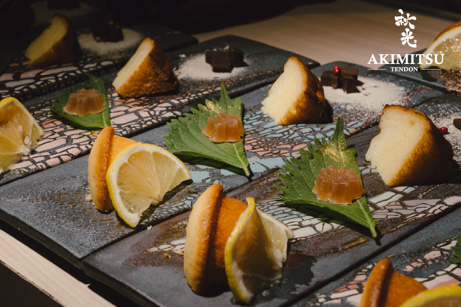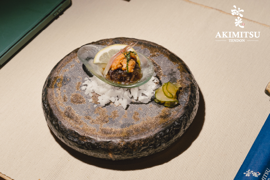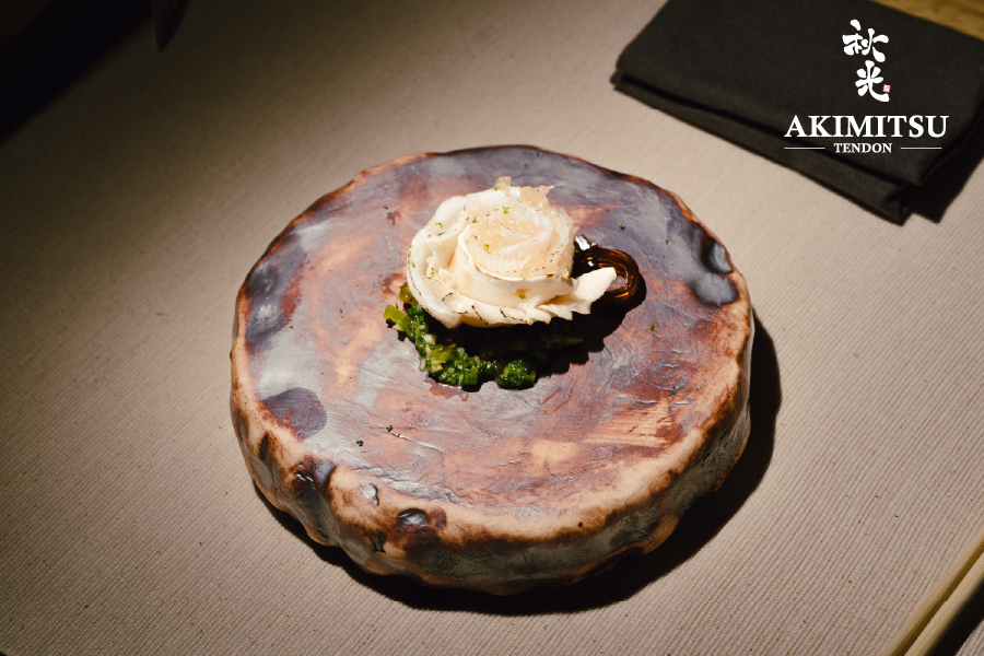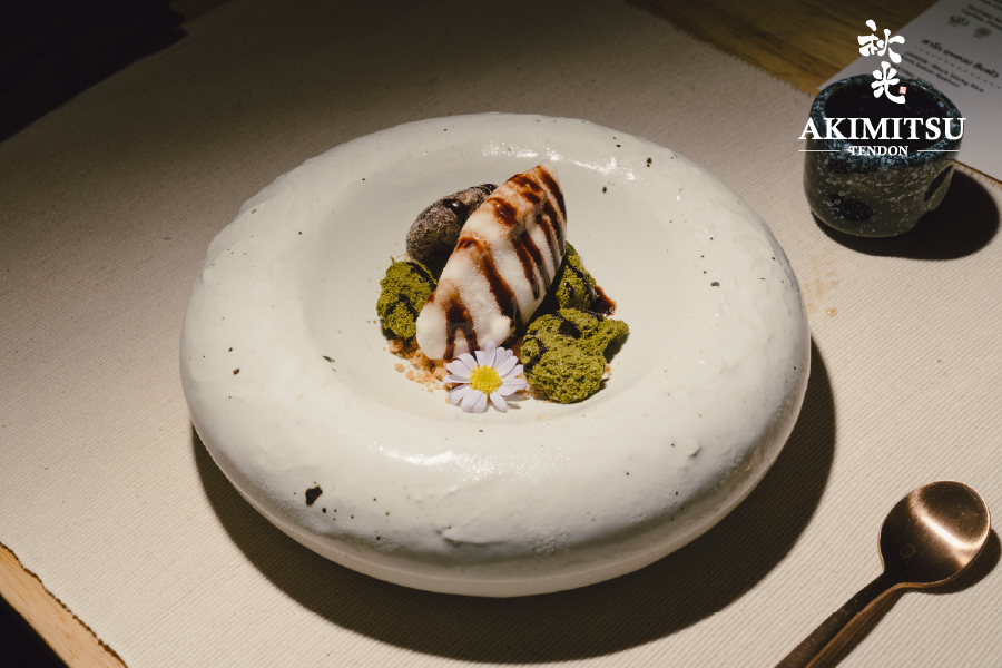 สำหรับเมนคอร์ส เชฟได้นำเสนอเทนด้งสูตรลับที่ผสานวัตถุดิบท้องถิ่นกับเทคนิคญี่ปุ่นอย่างละเมียดละไม ข้าวญี่ปุ่นถูกอบร่วมกับเห็ดชิตาเกะเพื่อดึงกลิ่นหอมตามธรรมชาติ เสิร์ฟพร้อมเทมปุระจากเห็ดหลากหลายชนิด รวมถึงเห็ดมอเรลที่บรรจงสตัฟไส้กุ้งและไข่เมนไตโกะ เคียงข้างด้วย Fukujintsuke หรือผักดอง 8 ชนิดที่คัดสรรมาอย่างพิถีพิถันเพื่อเพิ่มมิติของรสชาติ จานนี้ถูกรังสรรค์ในสองสไตล์เฉพาะตัวของ Akimitsu — ทั้งแบบ เทนด้ง และ เทนฉะ เสิร์ฟในชามเดียว เพื่อให้ผู้รับประทานได้สัมผัสความแตกต่างทั้งในรสชาติและเนื้อสัมผัสอย่างกลมกล่อมและน่าประทับใจ