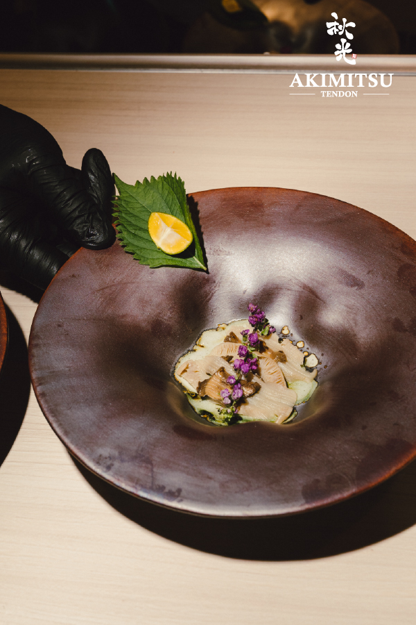 เริ่มต้นด้วยเห็ดหูหนูญี่ปุ่นในซุปดาชิใส ตามด้วยเทมปุระ Milky Queen ที่ทอดด้วยเทคนิคเฉพาะ เสิร์ฟในรูปแบบมาการอง พร้อมเป๋าฮื้อดองซาชิมิบน Cracker Seaweed
