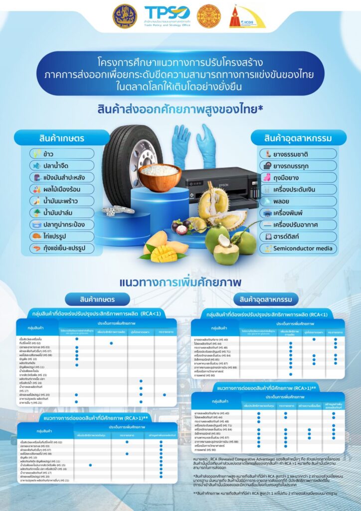 ผลการศึกษาการวิเคราะห์โครงสร้างการส่งออก พบว่า สินค้าอุตสาหกรรมยังเป็นหลัก (สัดส่วนราว 80%) โดยเฉพาะอิเล็กทรอนิกส์ ยานยนต์ และเครื่องจักร ขณะที่สินค้าเกษตรและอาหารมีบทบาทเพิ่มขึ้น โดยเฉพาะสินค้าแปรรูป เช่น ไก่ ปลา และผลไม้ ไทยยังมีความได้เปรียบในผลิตภัณฑ์ยาง ไม้ เครื่องประดับ เครื่องใช้ไฟฟ้า อิเล็กทรอนิกส์ และอากาศยาน อย่างไรก็ตาม การพึ่งพาตลาดส่งออกที่กระจุกตัวยังคงเป็นจุดอ่อน โดยแนวทางพัฒนาสินค้าเกษตรและอาหาร คือ การใช้ความได้เปรียบเชิงเปรียบเทียบในอาเซียน ส่งเสริมการแปรรูป และสร้างมูลค่าเพิ่มด้วยซอฟต์พาวเวอร์และกระแสรักษ์สิ่งแวดล้อม ส่วนสินค้าอุตสาหกรรมควรมุ่งเพิ่มมูลค่า ผ่านการสนับสนุนด้านจัดซื้อจัดจ้างภาครัฐ สาธารณูปโภค การวิจัย พัฒนา และรับรองมาตรฐาน โดยผสมผสานการผลิตสินค้ามูลค่าต่ำแต่ปริมาณมากกับสินค้ามูลค่าสูงแต่เสี่ยงและใช้เวลา